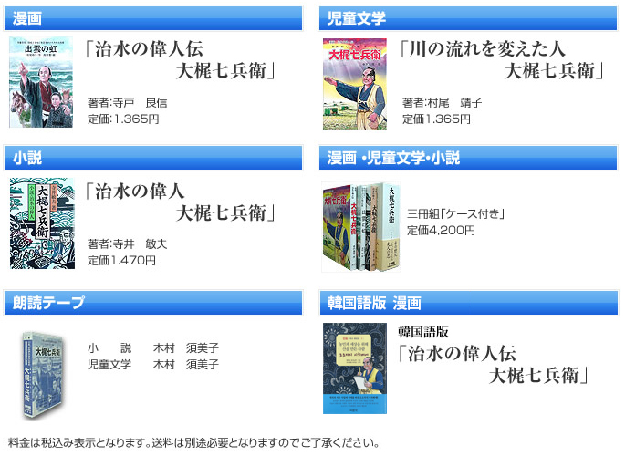 出雲地方における治水の偉人、八雲村・意宇川の切通し開削「周藤弥兵衛」(1994年刊行)、鹿島町・佐太川開削「清原太兵衛」(1997年刊行)、このたびの出雲市「大梶七兵衛」を日本で初めての企画である児童文学、小説、漫画の三部作により出版、『出雲三兵衛』として世に送り出すことができました。