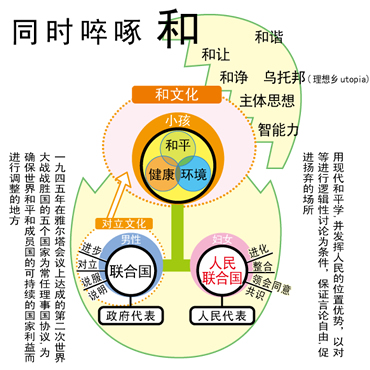 把中国的"和谐"文化,跟出云诞生的"和让",韩国的"和诤("理想乡utopia"),美国的"巧实力",北朝鲜的"主体思想"等,用教养,艺术,幽默等组合起来,就是"和文化"诞生的舞台,即"人民联合国"。