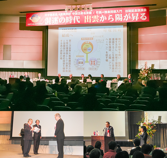 「中日韓英四カ国語によるグローバル時代の人間学 中国古典名言録」と、研究所理事である内藤正中島根大学名誉教授による「竹島=独島問題入門」の出版を記念し、「竹島の日」を生かすとの視点から、中国の学苑出版社より孟白社長、馬紅治編集長、張可喜新華社通信元東京駐在の参加を得て、第四回目の竹島の日にあたる2月22日、松江市のくにびきメッセに700人が集まり、出版記念講演会「混迷の時代、出雲から陽が昇る」を開催した。