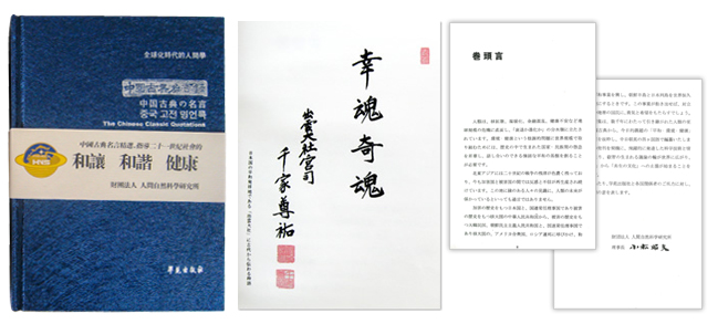 出雲大社の神語「幸魂奇魂」を千家尊祐宮司様に頂き、日中韓英の四ヶ国語で、グローバル時代の人間学「中国古典名言録」を、北京の学苑出版社で編纂した。