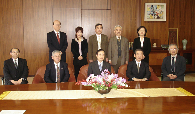 左から、チェ・ドンス黄海道民副会長、菅原敏允史談会長、小松理事長、キム・ヒョンチョル顧問、ジョ・スハン社長