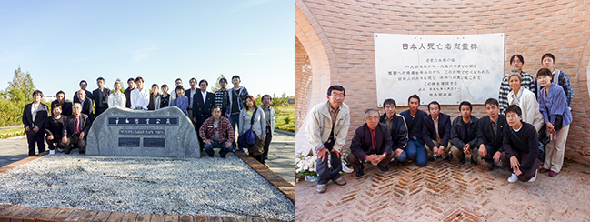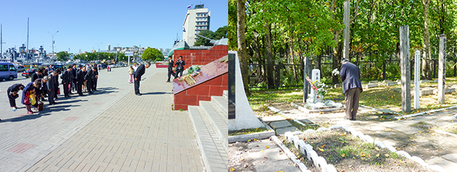 (左写真)ウラジオストク第二次世界大戦慰霊碑に献花 (右写真)ハバロフスク日本人墓地に献花
