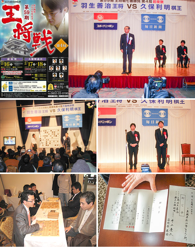 2010年(平成22年)2月16日(火)~18日(木) 羽生善治王将(39)と挑戦者・久保利明棋王(34)が対局される第59期王将戦の第1局が大塚美術館の礼拝堂で行われ、第4局は小松電機産業株式会社・人間自然科学研究所の特別協賛により、松江市のホテル一畑で行われました。久保利明棋王が羽生善治王将に4勝2敗で制しタイトル奪取。初の王将位獲得となりました。