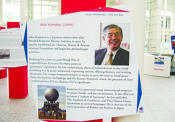 カーネギーの寄付によって創設された「平和宮」(オランダ・ハーグ市、国際司法裁判所など国際機関が多数入っている)の100周年記念事業「世界の平和フィランソロピスト(事業化)20人」展に小松理事長が選ばれパネル展示されました。現地の様子やフィランソロピストなど詳細はダウンロードしてご覧ください。